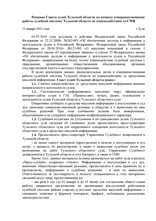 | Решение Совета судей Тульской области от 31.01.2011 | версия для печати |